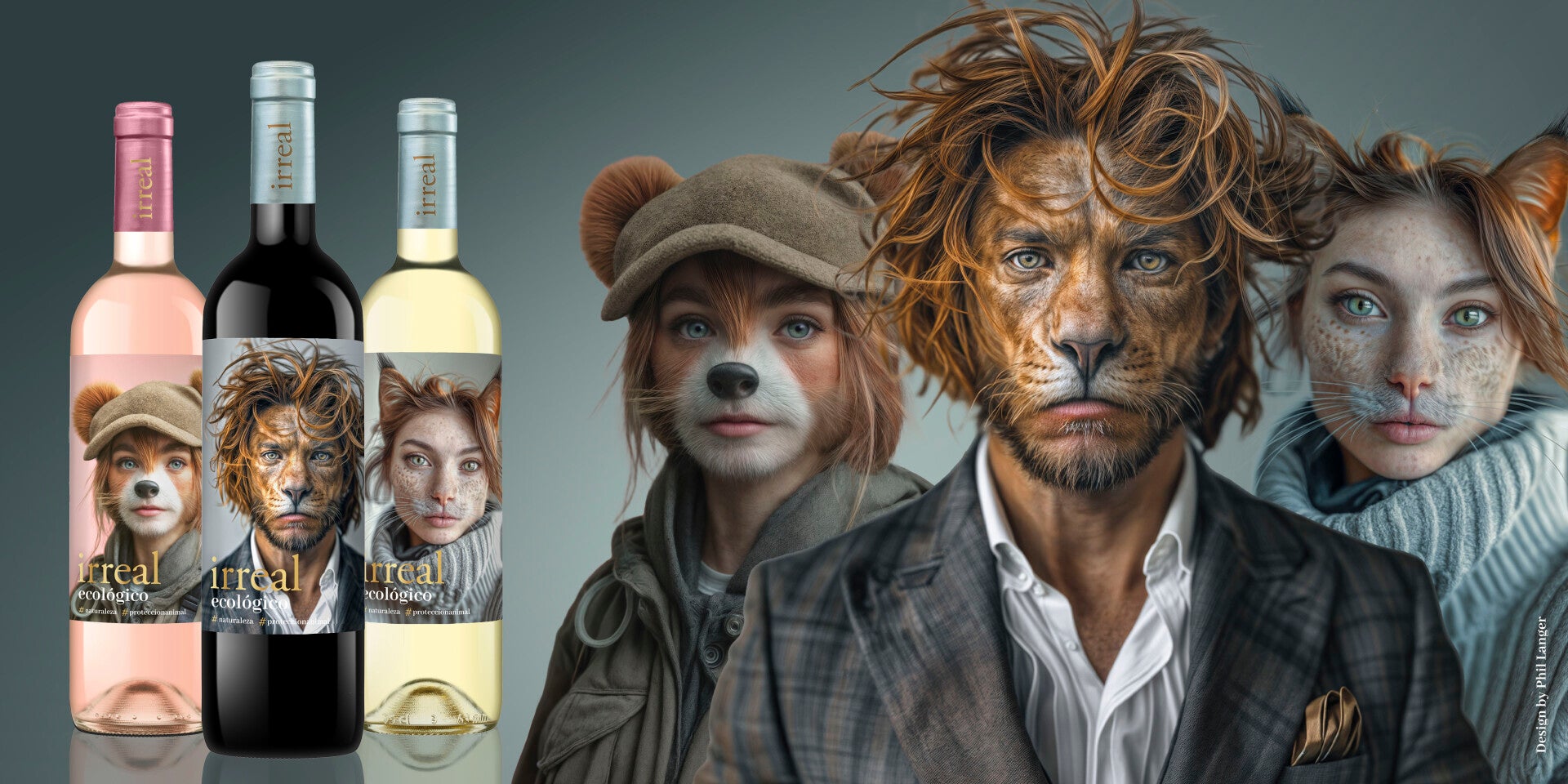 Las tres etiquetas de los vinos Irreal han sido diseñadas por el artista alemán Phil Langer aplicando la inteligencia artificial para humanizar los rasgos de tres especies amenazadas, el león para el vino tinto, el lince para el blanco y el panda rojo para el rosado.